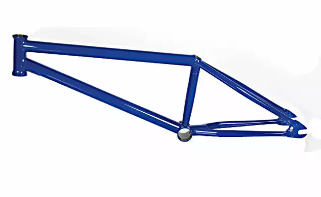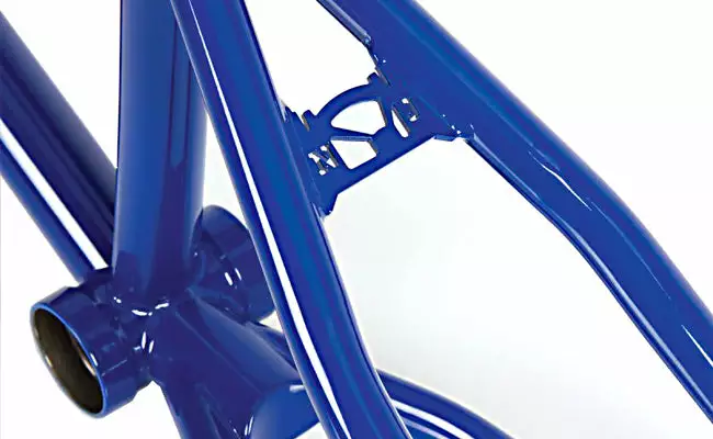 TUNNEL FRAME Vinnie Sammon signature frame featuring heat–treated, double butted (with internal gussets) Mugen tubing (20% stronger than 4130 chromoly) for the top–tube and down–tube. The rest of the tubing is heat–treated 4130 chromoly. External down–tube gusset. The chain–stays have a wishbone design and start off ovalized then blend into tapered round tubing. The seat–stays taper and along with the chain–stays are designed to fit wide tires. The seat–tube is externally butted and ovalizes towards the bottom and works with a wedge post only (included). Removable brake mounts thread into the seat–stays. Uses an Integrated headset (11/8″) and a MID bottom bracket.