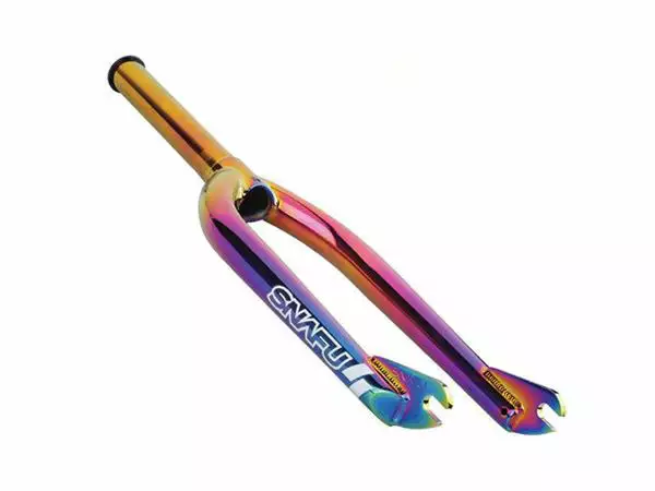 The Snafu 2.0 BMX Race Fork features heat-treated chromoly for maximum strength. The Snafu 2.0 Race Fork also features a 1-pc machined and reinforced steer tube with an integrated bearing race (for use with 1-1/8″ integrated 45° headsets) and a built in alloy compression cap.
