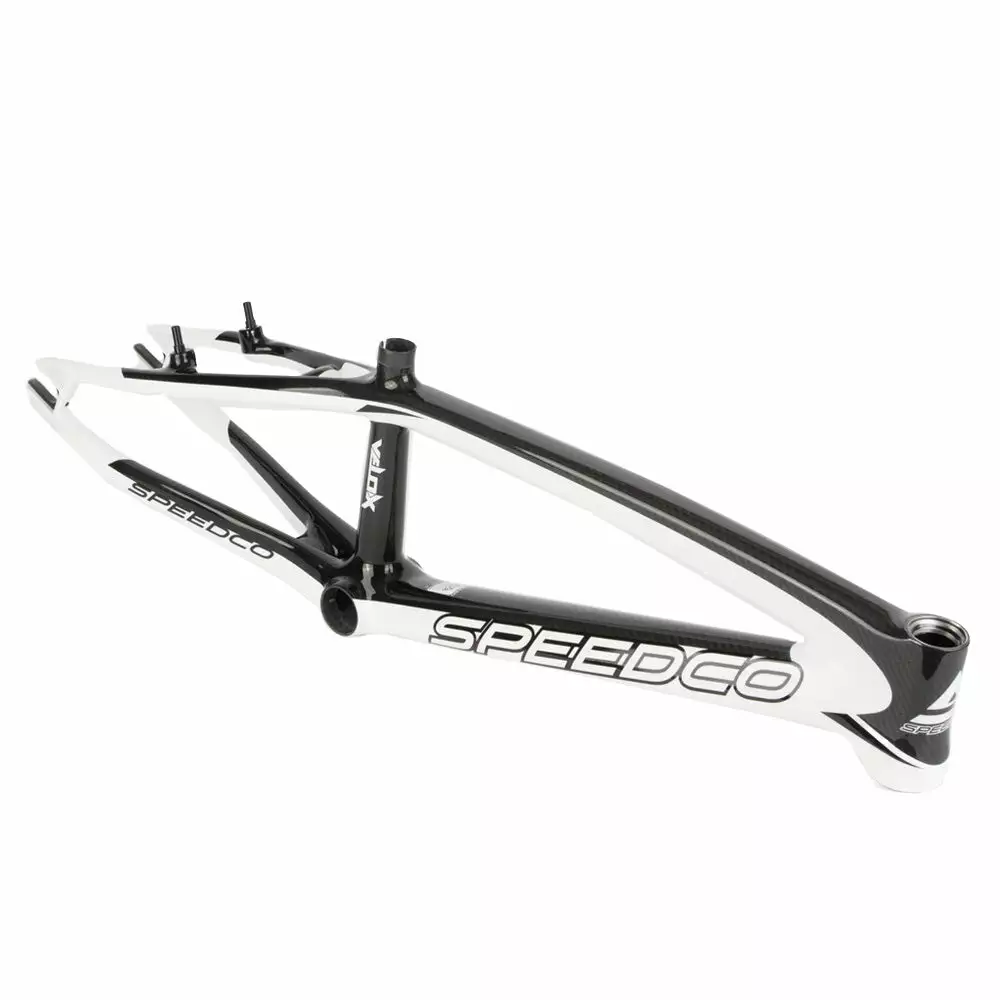 The SPEEDCO Velox 2 Carbon Frame – Gloss White/Black features T700 Toray carbon fiber, the highest strength carbon for BMX frames. The use of this material allows the Velox to maximize rigidity and strength while keeping it one of the lightest race frames on the market today. The Speedco Velox delivers 3 new sizes for the 2018 model year including the Pro XL-L and Pro XXL with an extended 15.25″ rear chainstay as well as the addition of a 22″ top tube Pro XXXL.
