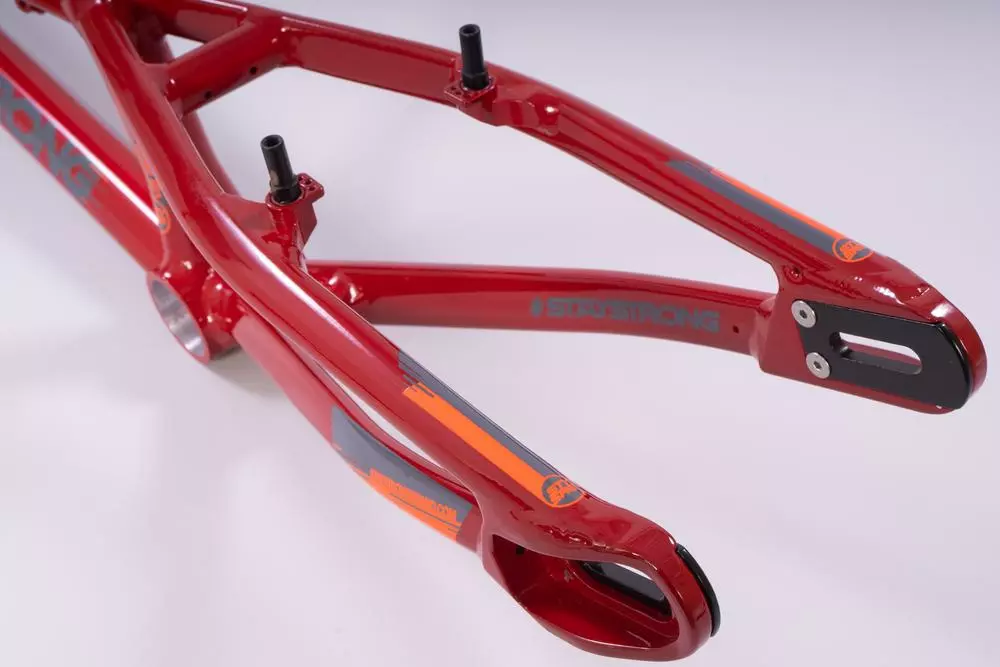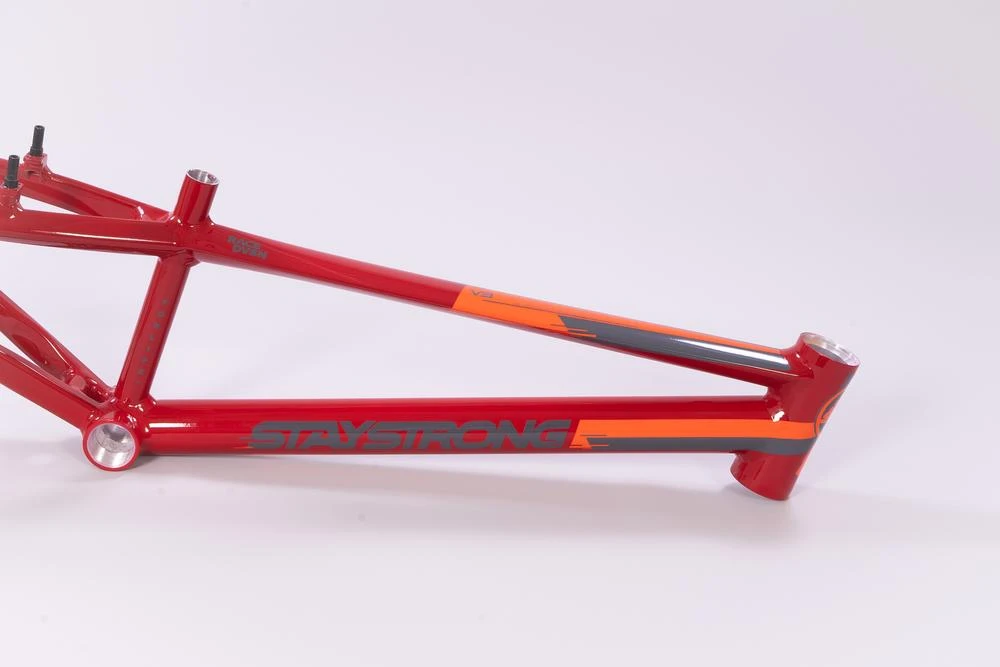The Stay Strong For Life V3 BMX Race Frame-Red is a full evolution from the V2 and V1 race frames. It carries over the high-level of construction and race-winning DNA of its forebears, but with an all-new frame geometry resulting in greater stiffness and rideability while lowering the overall weight. The Mini through Expert XL run a 22.2mm seat post and have open 10mm rear dropouts. The larger sizes (Pro on up) all run a 31.6mm seat posts and have closed 20mm rear dropouts with 10mm and 15mm adapters and integrated chain tensioners. The frame is set up for a V-brakes but is of course capable of running disc brakes if using an adapter. This frame is engineered to the highest standards and features smooth precision welds with extra butting throughout. The frame shape is nice and low to keep up the most efficient level of power transfer.
