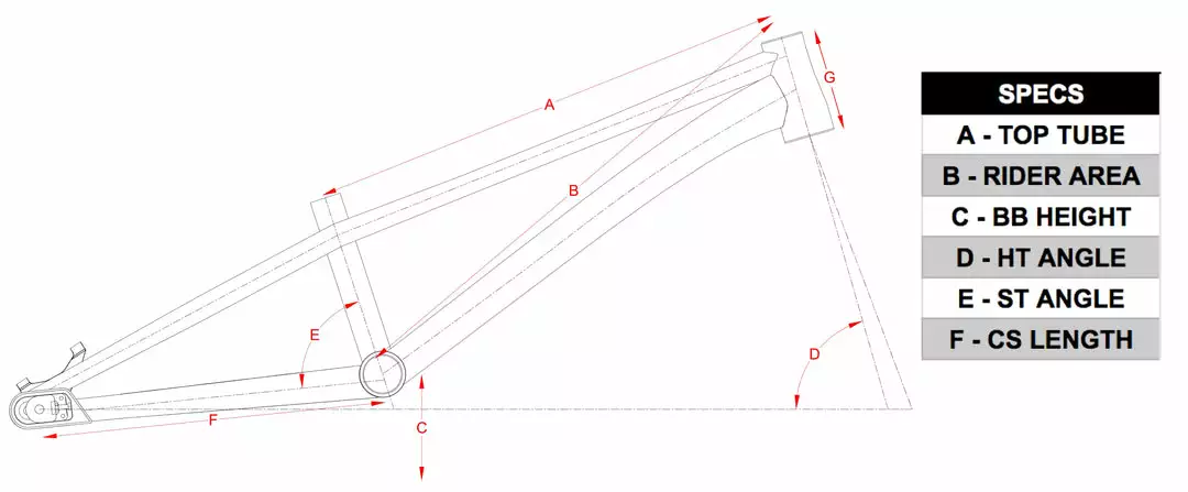 | Size: Mini | Top Tube: 17.5″ | CS (Min): 12.3″ | CS (Max): 13.4″ | Head Angle: 72 | Heat Tube: INT 1-1/8″ | ST Angle: 69 | BB Height: 269.2mm | BB: EURO | Seat Post: 22.2mm | Seat Clamp: 25.4mm | Rider Area: 510mm |