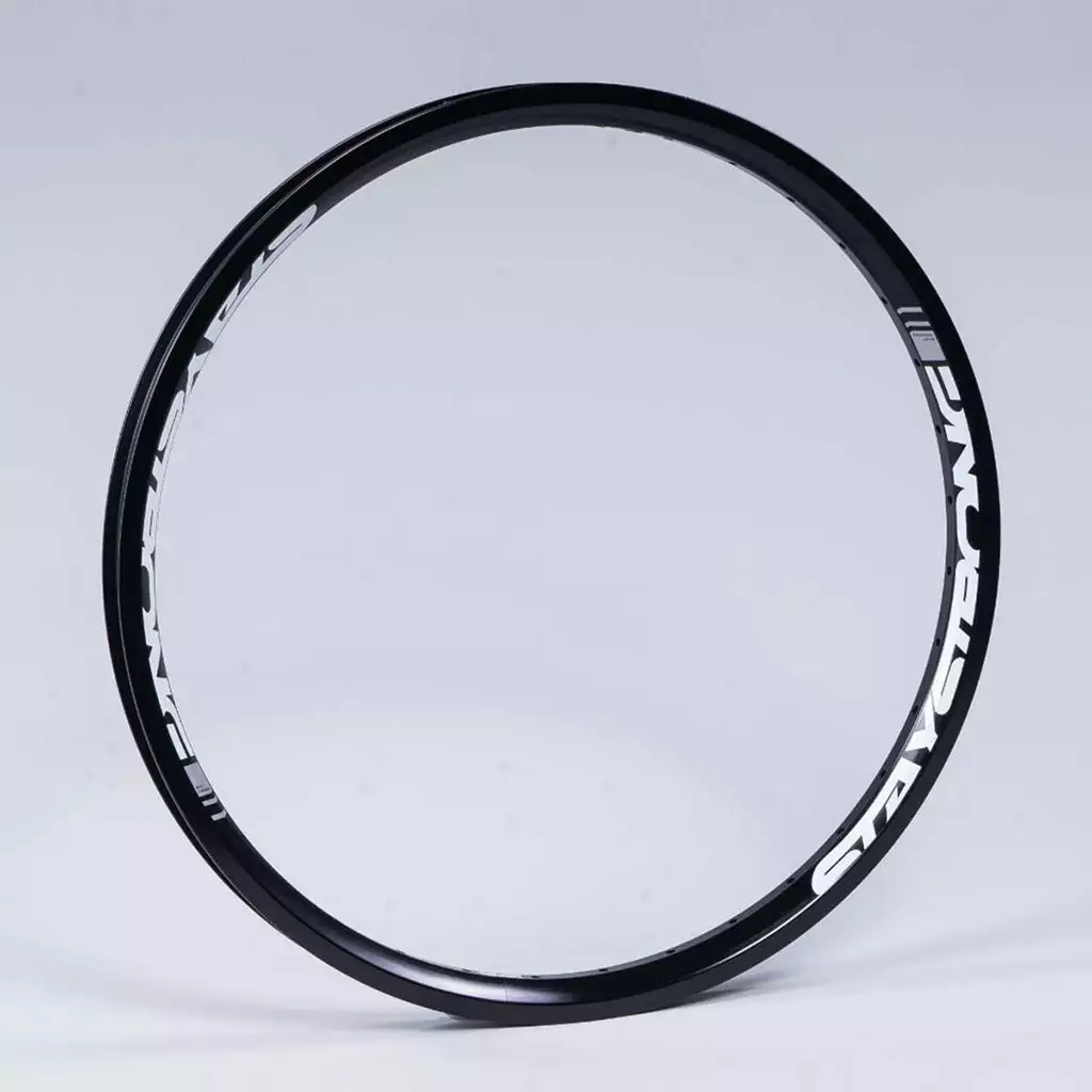 The Stay Strong Reactiv BMX Race Rim-Front-20×1.75″ is a great way to upgrade an otherwise “okay” race bike into something more befitting your champion racer. Made from lightweight alloy with a sleeved joint. Classic black with white graphics. This being a “front” rim, it has no braking surface. So if your kid is an old school caliper braker then they’ll need to pair this with a “rear” rim. If they are a disc braker then get two of these and call it a day.