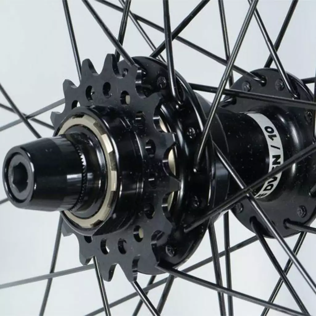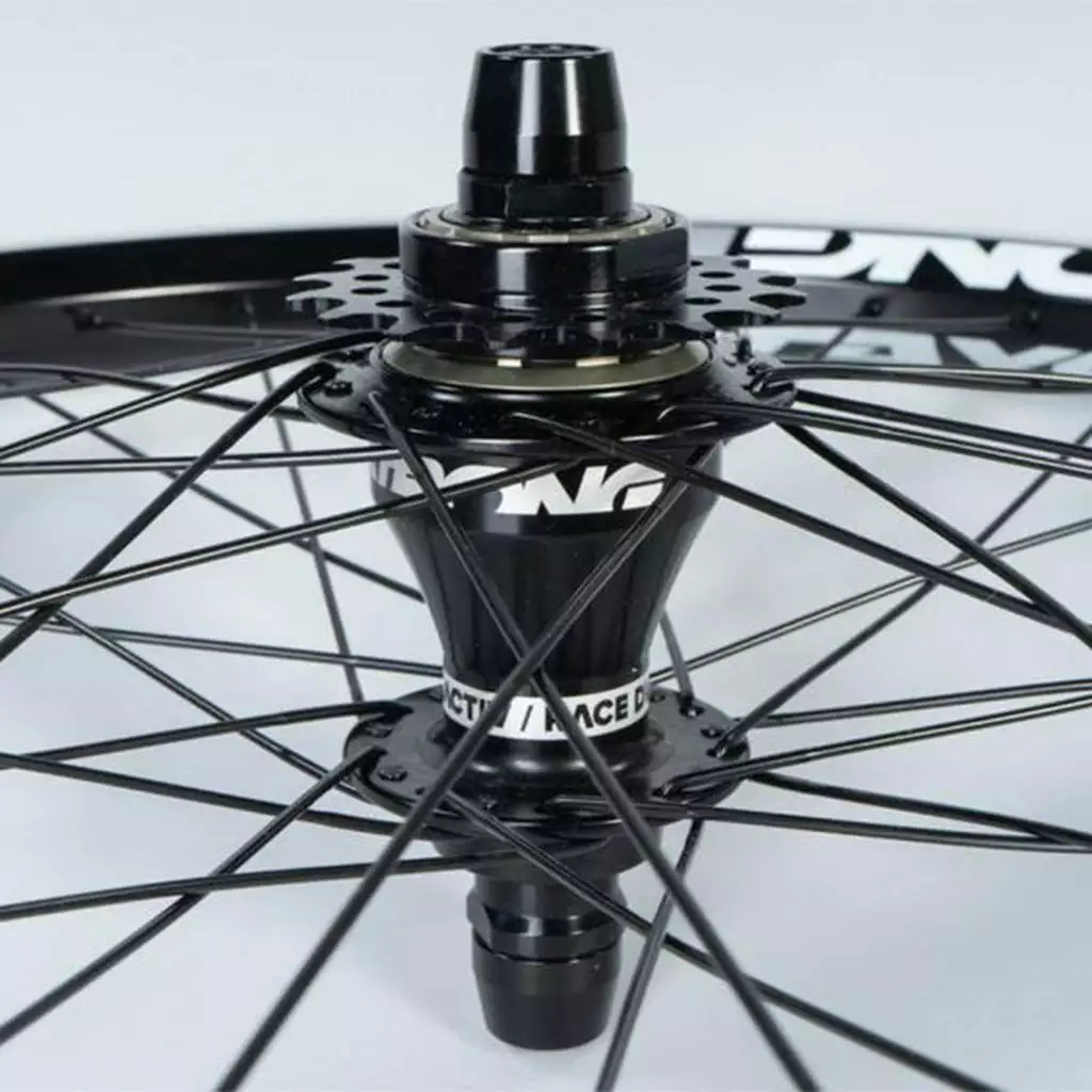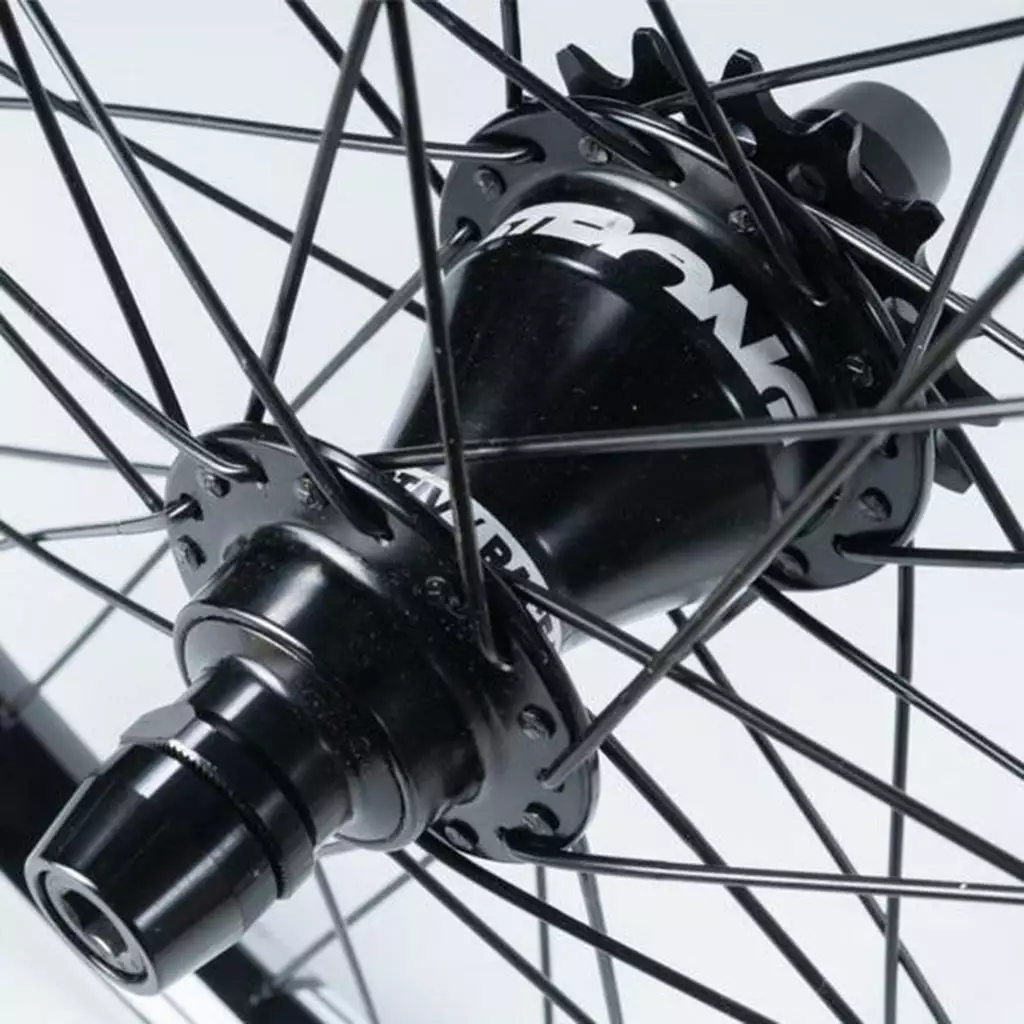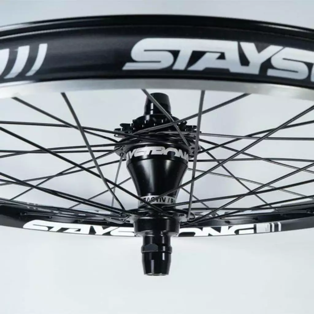 You know that Stay Strong makes the best rims around so why not get in on the good stuff with the Stay Strong Reactiv BMX Race Wheelset-20×1.75″ The aero-profile, alloy race rims have 36 hole patterns and pinned joints. The white Stay Strong “Cut Off” graphic looks striking on the black anodized metal. As with most wheelsets the rear rim has a CNC machined braking surface for those of the caliper brake persuasion. These top line rims are professionally laced up to Stay Strong Reactiv hubs with 10mm axels. The rear hub has 6 pawls, 180 points of engagement, and comes with a 16T cog. Get ‘em while they’re hot!