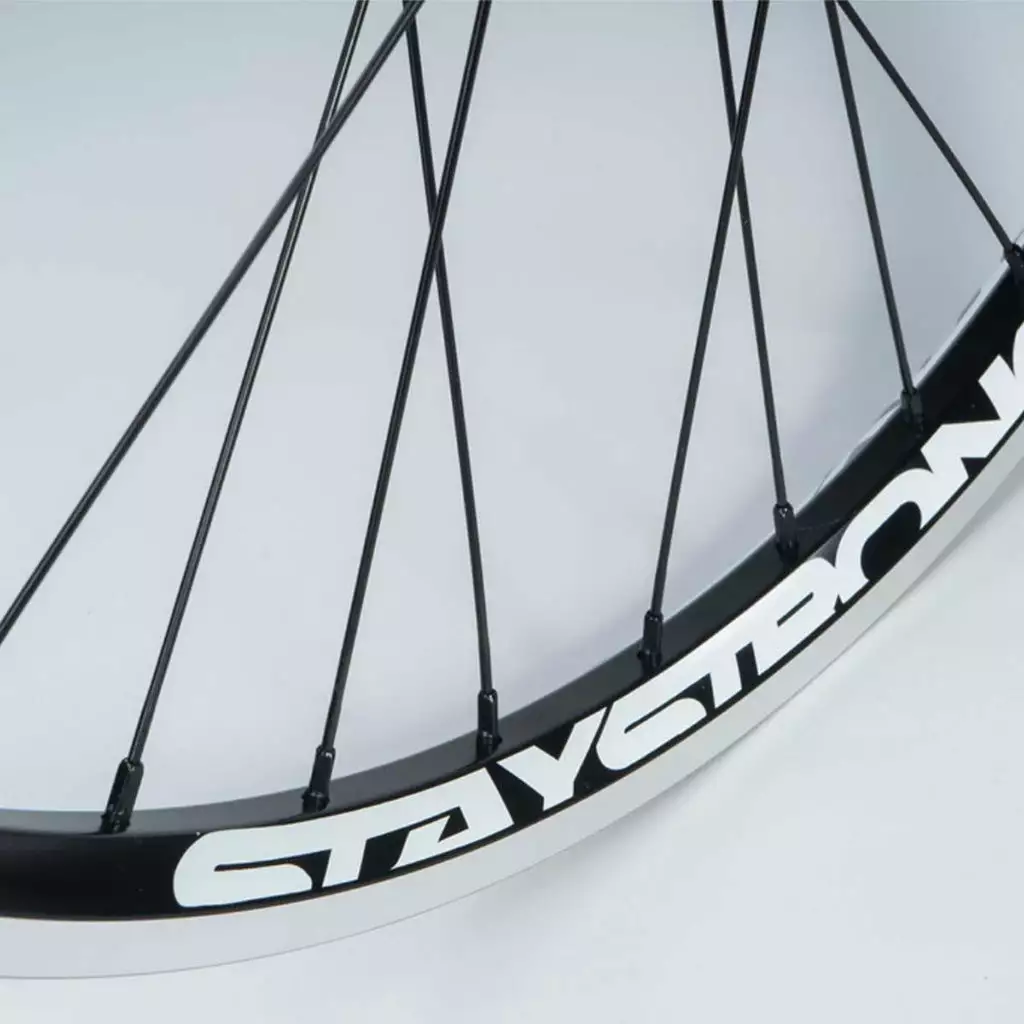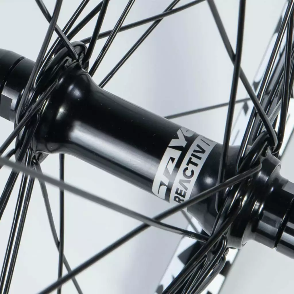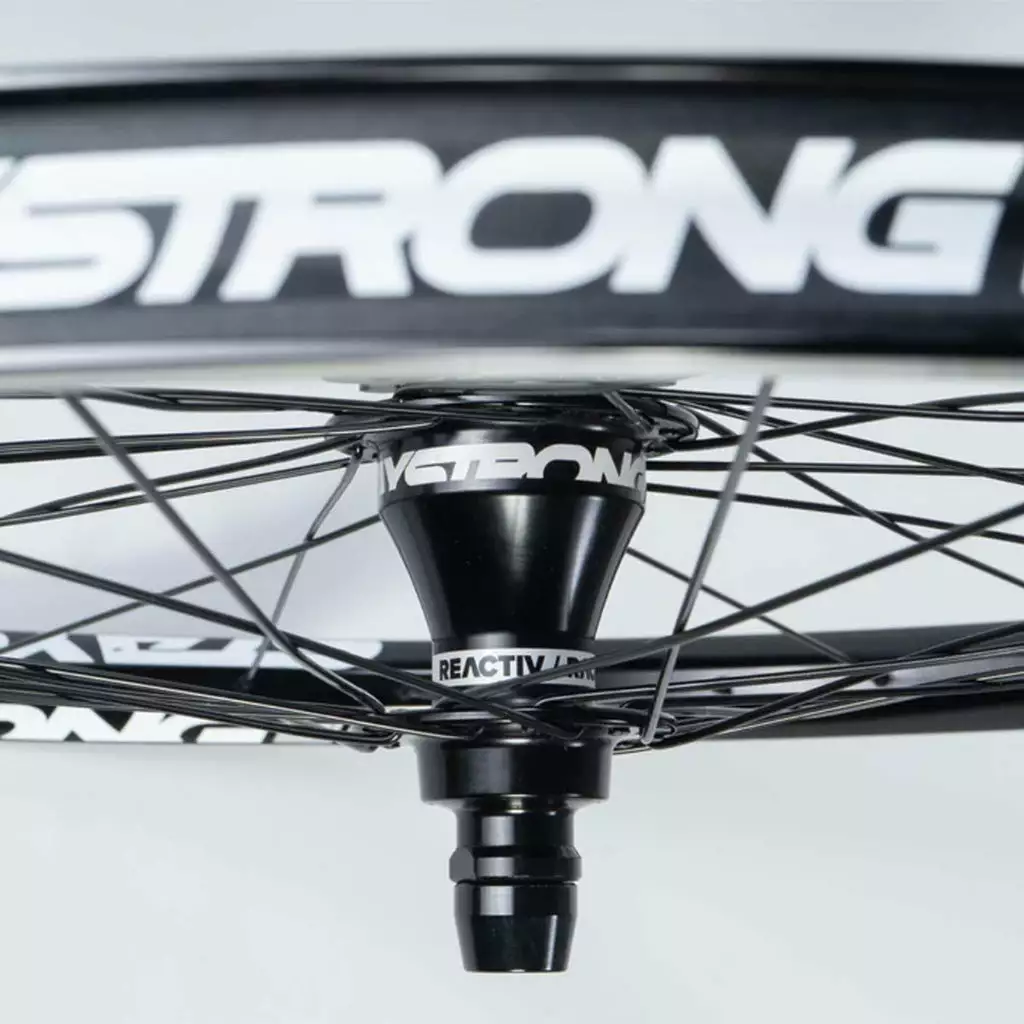You know that Stay Strong makes the best rims around so why not get in on the good stuff with the Stay Strong Reactiv BMX Race Wheelset-24×1.75″ The aero-profile, alloy race rims have 36 hole patterns and pinned joints. The white Stay Strong “Cut Off” graphic looks striking on the black anodized metal. As with most wheelsets the rear rim has a CNC machined braking surface for those of the caliper brake persuasion. These top line rims are professionally laced up to Stay Strong Reactiv hubs with 10mm axels. The rear hub has 6 pawls, 180 points of engagement, and comes with a 16T cog. Get ‘em while they’re hot!