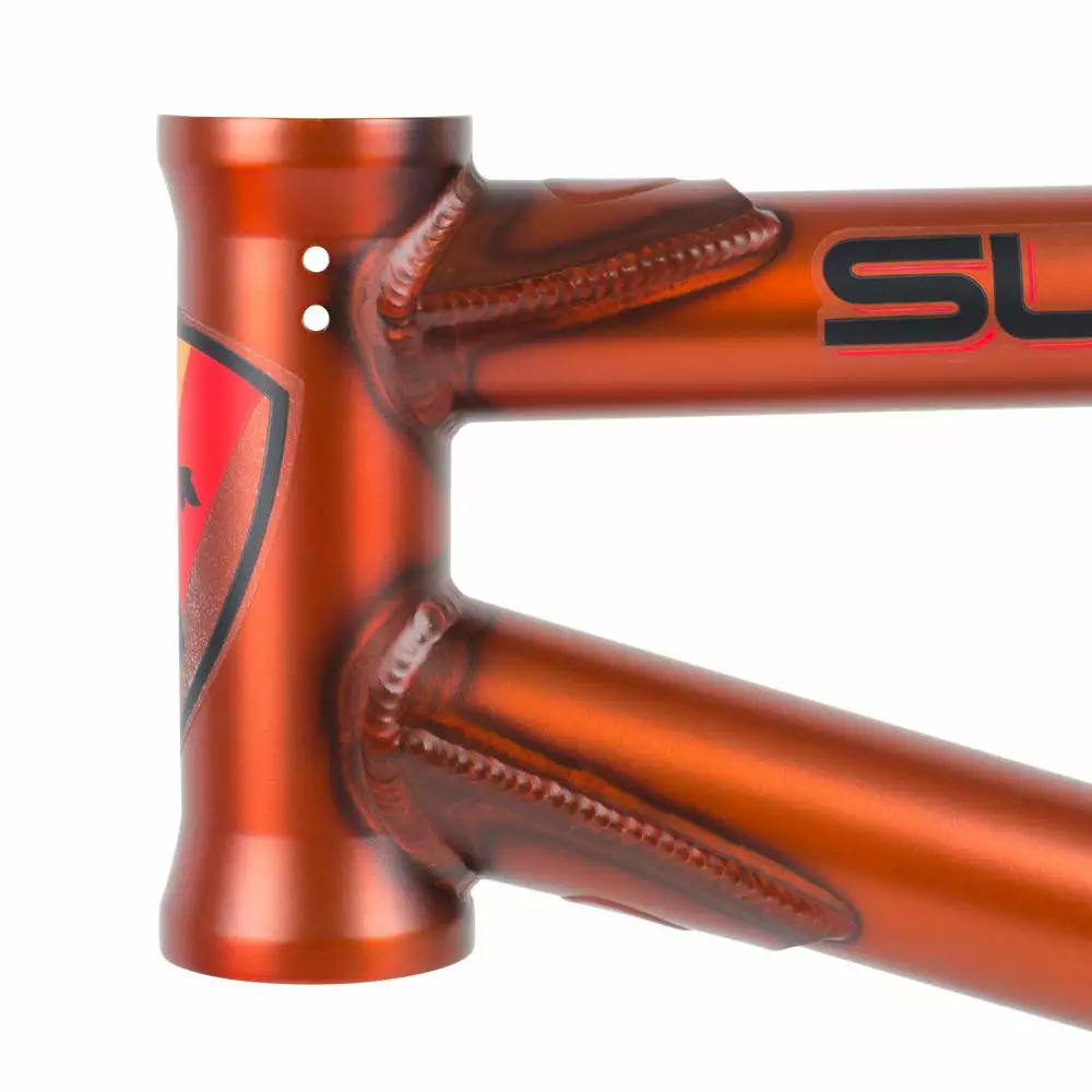 The Subrosa MR2 BMX Frame-Matte Trans Orange is Subrosa team rider Matt Ray’s signature frame version 2. Changes from the original MR1 include, but are not limited to: A slight increase in the standover height for a bit more over-all stability and a decrease in instances of “falling over while just sitting there.” The bottom bracket was also raised a smidgeon for more applied leverage to the rear tire (translation: more POP!) The dropout slot is now longer, allowing for better compatibility with a range of gear ratios. Bonus: also makes removing the rear wheel that much easier…an all around win.