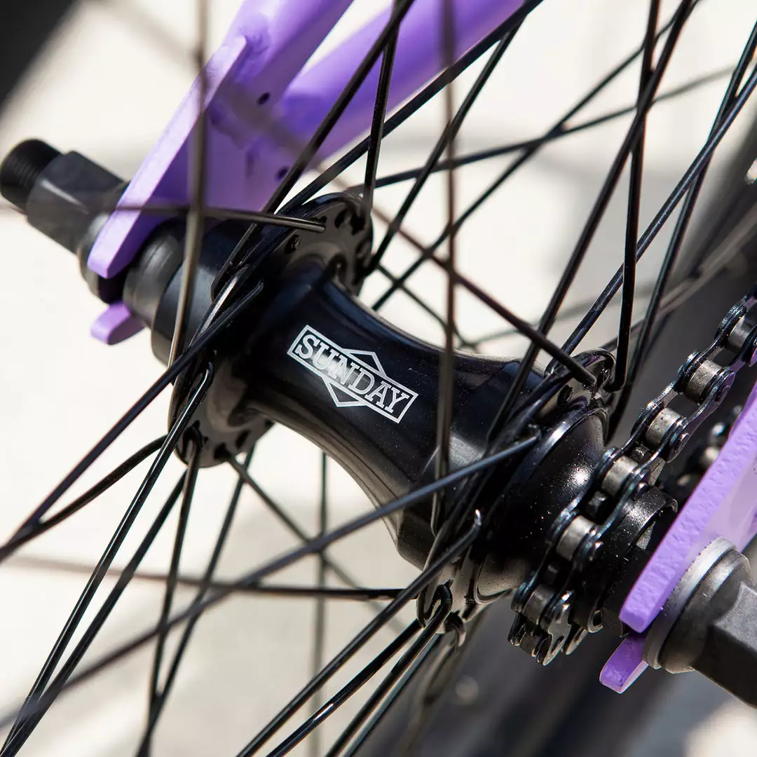 - Rear Hub: Sunday, 36H, sealed, 14mm axle w/ 9T Driver