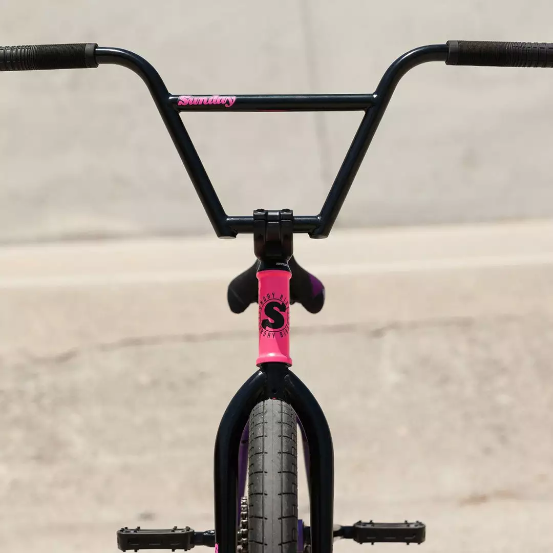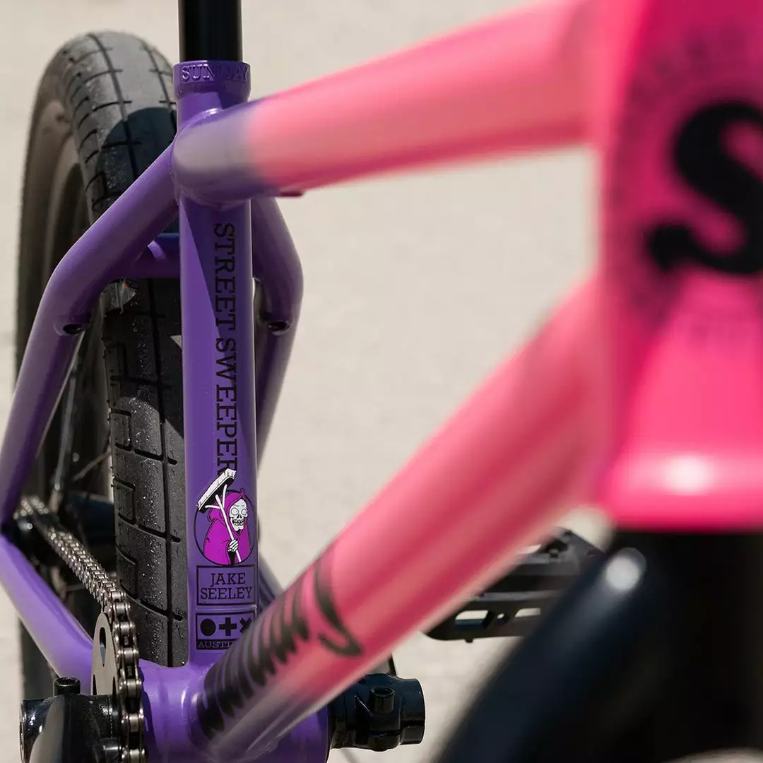 Check out Jake Seeley’s 2022 signature complete bike the Sunday Street Sweeper LHD 20.75″TT BMX Freestyle Bike-Matte Hot Pink/Grape Fade. Sunday started with Jake’s signature frame and made a freestyle monster using a slew of Odyssey aftermarket parts, Sunday Jake Seeley grips, and special to this bike Sunday Street Sweeper v2 tires. The frame’s geometry was chosen specifically to match Jake’s technical riding style and features a profoundly short chainstay and higher bottom bracket. Speaking of the mid bottom bracket we’d love to let you know that it is indeed sealed, as is the low-flange front hub and Odyssey Clutch v2 freecoaster in the back. Would you expect anything less from a bike on this level?
