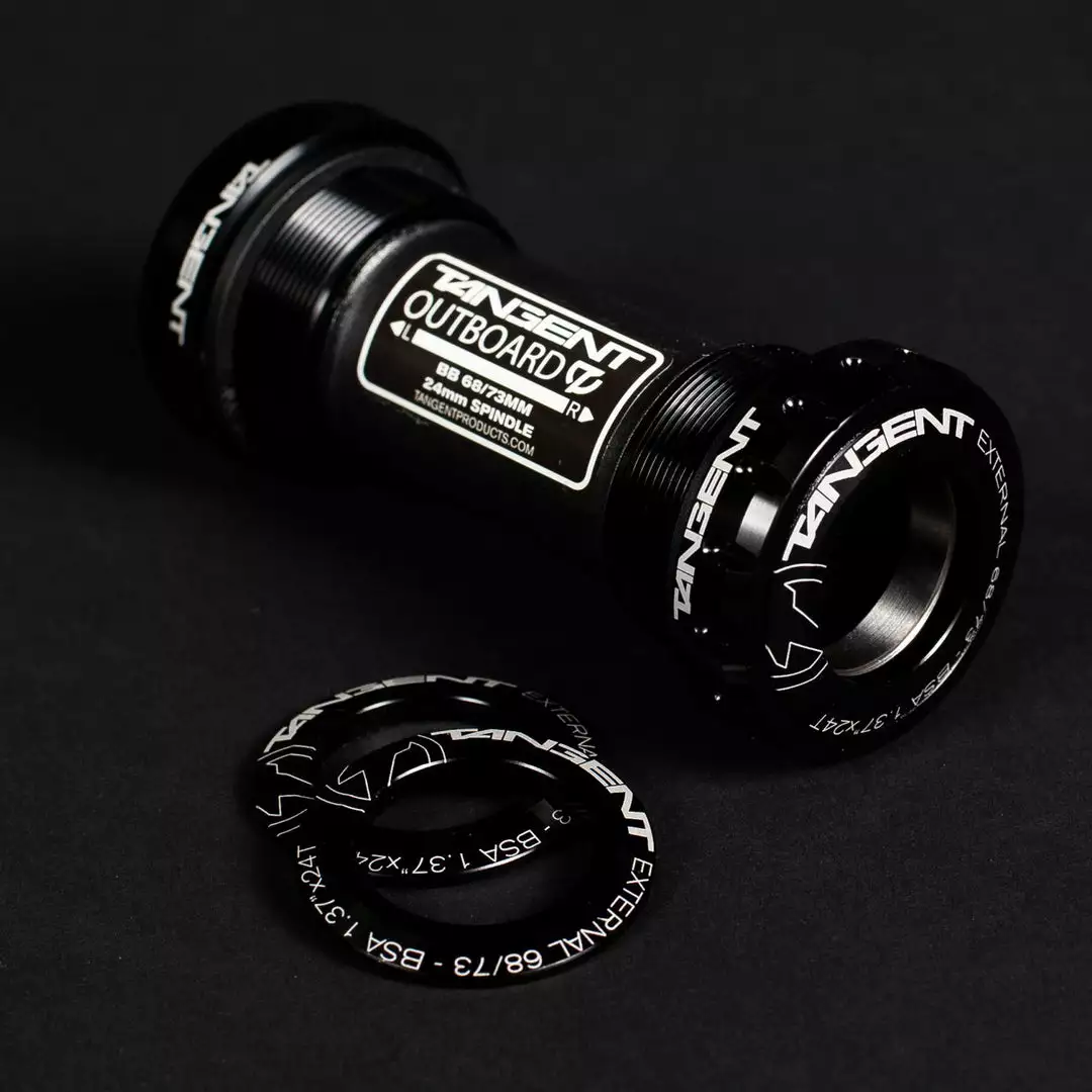 The Tangent Outboard Euro Bottom Bracket is compatible with 24mm race cranks. Featuring low friction Japanese bearings and custom designed alloy dustcaps which take the place of plastic or alloy spacers and are designed to fit Shimano DXR cranks and the like.