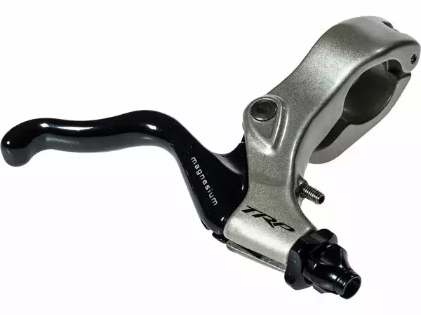 The Tektro TRP Magnesium v-brake lever features a hinged mount and magnesium lever.