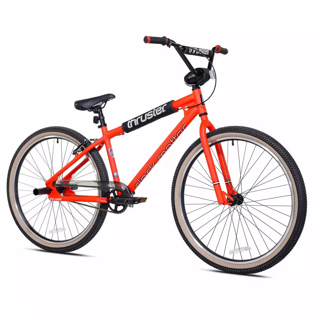 Take your riding into the cosmos with the Thruster Dark Matter 27.5″ BMX Freestyle Bike-Satin Neon Red. Featuring a super light 6061 alloy frame, the chromoly forks link up with the super wide 29″ steel handlebars through a beefy 28.6mm alloy stem. Alloy platform style pedals connect you to the 3pc Chromoly crank set, which bring a 32T Chainwheel and 16T freewheel together to drive the 27.5″ double alloy walled wheels, resting on beefy 27.5″ x 2.1″ tires.