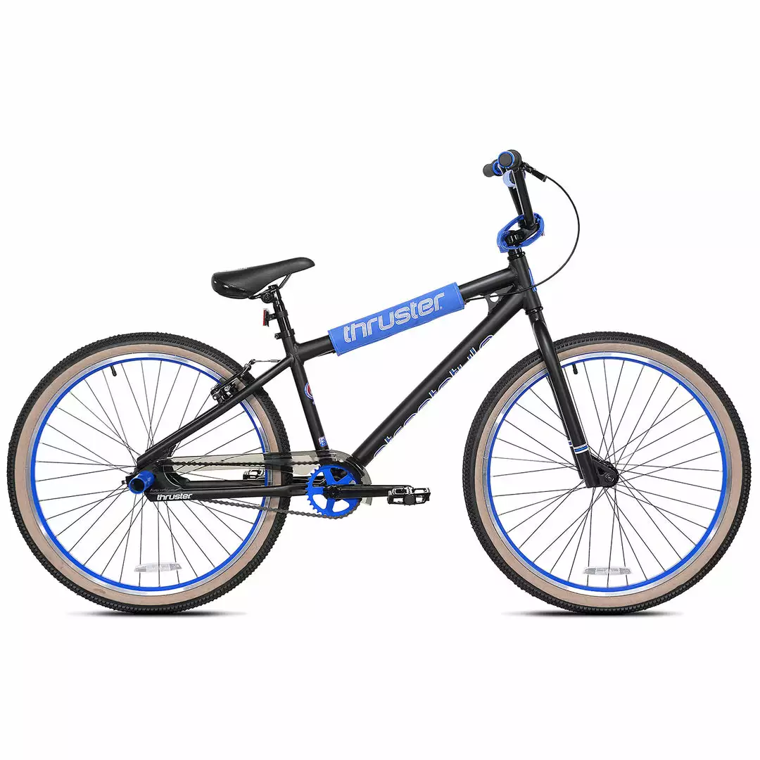 Cruise town in satiny black glory with the Thruster Street Style 26″ BMX Freestyle Bike-Satin Black. With a 6061 aluminum frame, ultra wide 29″ handlebars, and big ol’ 26″ tires this bike is so smooth cruising the rough city tarmac you won’t even need the included seat padding! But it’s there anyway to help keep your ride cush.