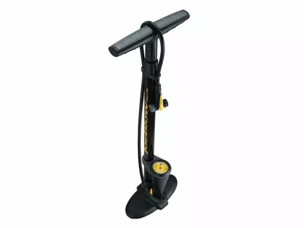 Heavy duty steel chamber and foot base provide for a durable sturdy pump. Includes a padded handle. Built in high pressure gauge for accurate readings and a dual valve head for use on Schrader or Presta valves without the use of adapters.