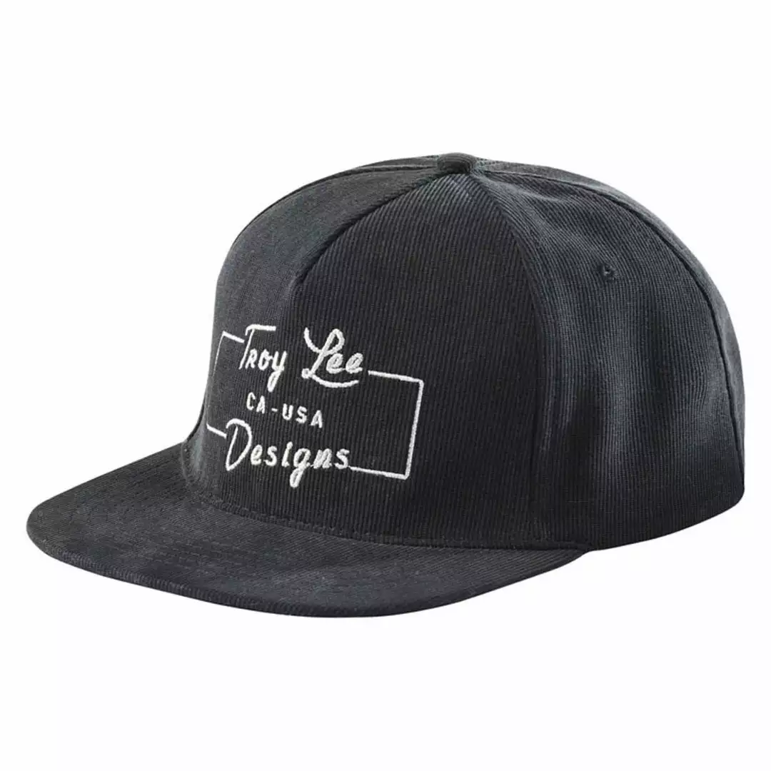 The Troy Lee Designs All American Hat features 5-panel, flat visor snapback Corduroy hat. Screen-printed patch at front, plastic adjustable snapback at TLD flag label at back.