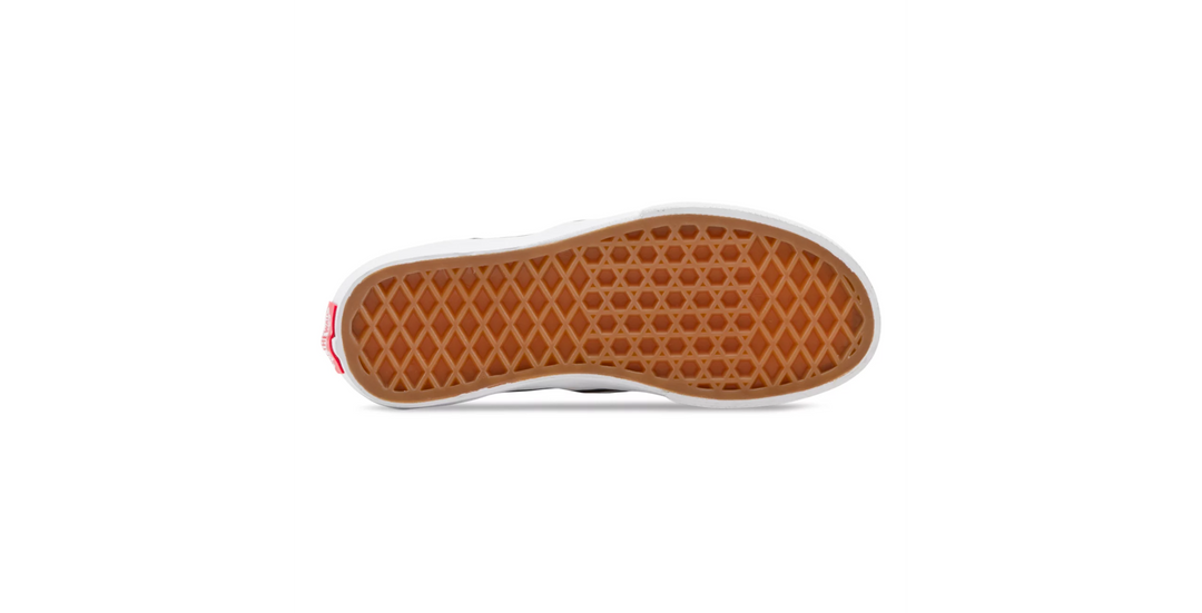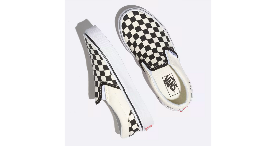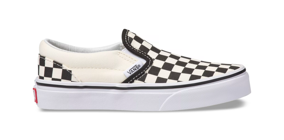 The Vans Classic Slip-On Kids Shoe-Black/White Checkerboard has a low profile, slip-on canvas upper with all-over checker print, elastic side accents, Vans flag label and Vans original Waffle Outsole.