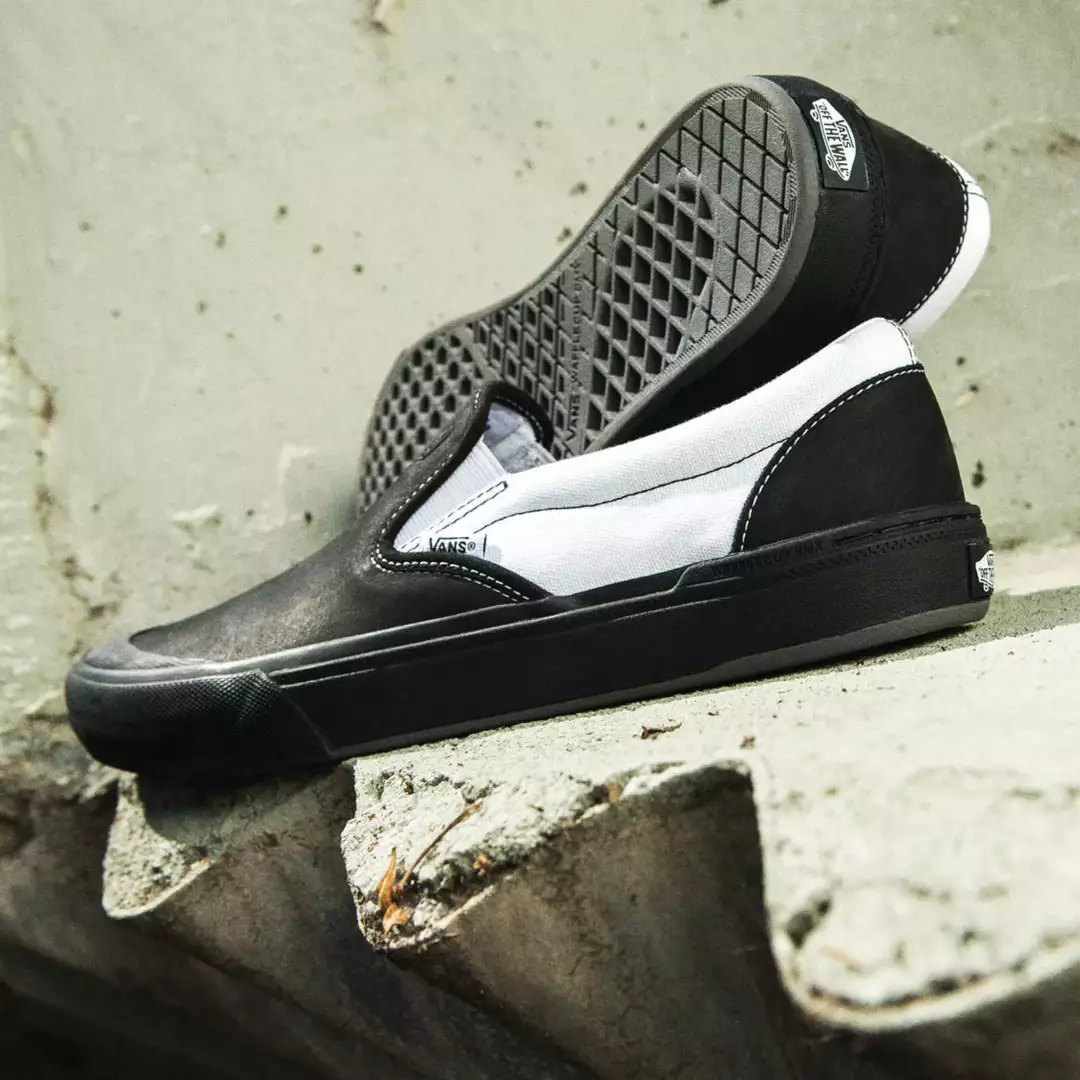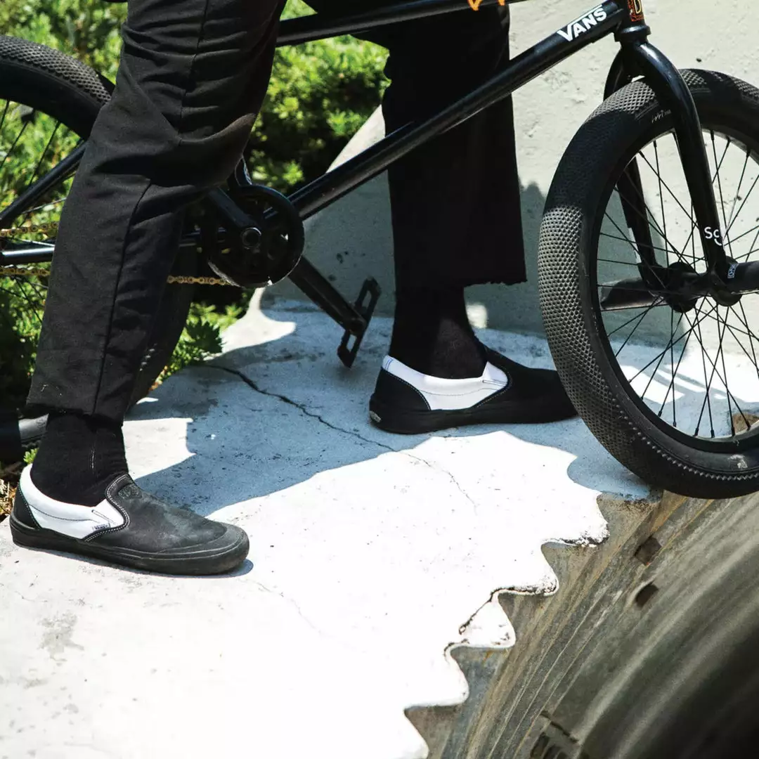 Vans have teamed up with Dakota Roche to bring you his take on the classic Vans Slip-On. The Vans Dak Slip-On BMX Shoes-Dak Black/White features a first of its kind Wafflecup with the original Vans gum rubber compound for the best pedal feel and protection in a BMX shoe. The canvas and leather uppers are embossed with logos and stylish colors and lines.