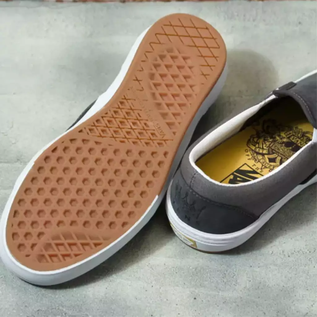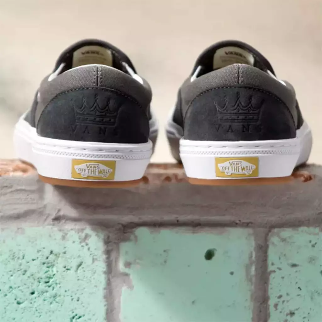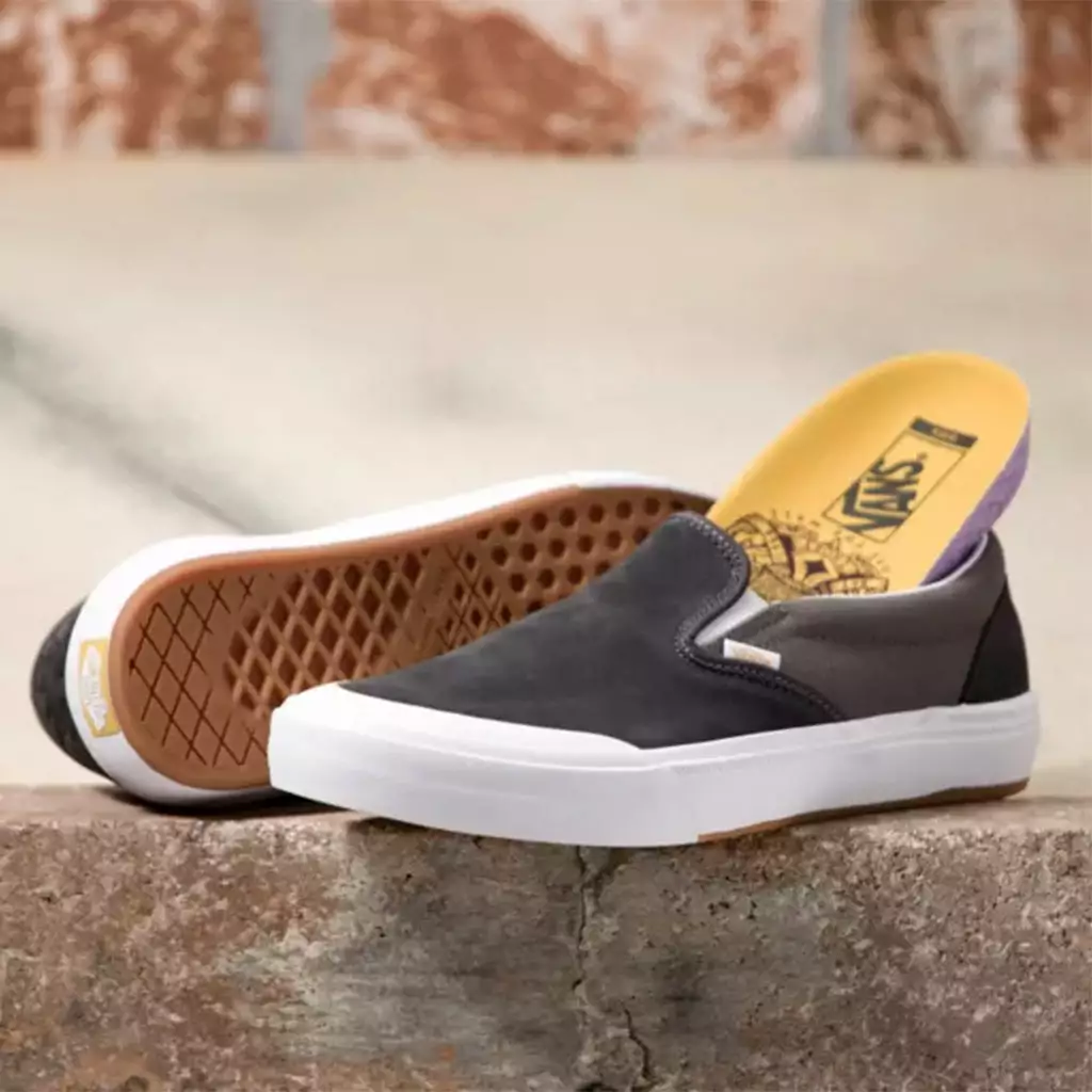 These Vans Dan Lacey Slip On BMX Shoes-Asphalt/Pewter were created in collaboration with legend Dan Lacey with the BMX rider in mind. Vans’ Popcrush Cushioning provides protection from impact and added comfort so you can ride longer. Reinforced Duracap construction in the highest-wear areas of the shoe means added durability for a longer lasting shoe.