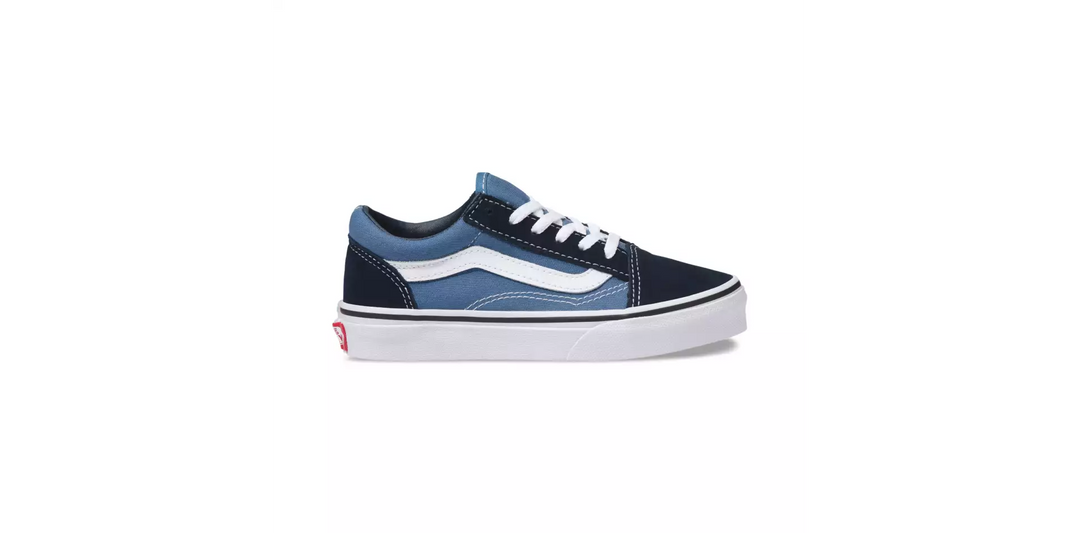 The Vans Old Skool Kids Shoes-Navy-True White features the iconic side stripe, ia low top lace-up style with a durable canvas upper, padded tongue and lining, metal eyelets and Vans original Waffle Outsole.