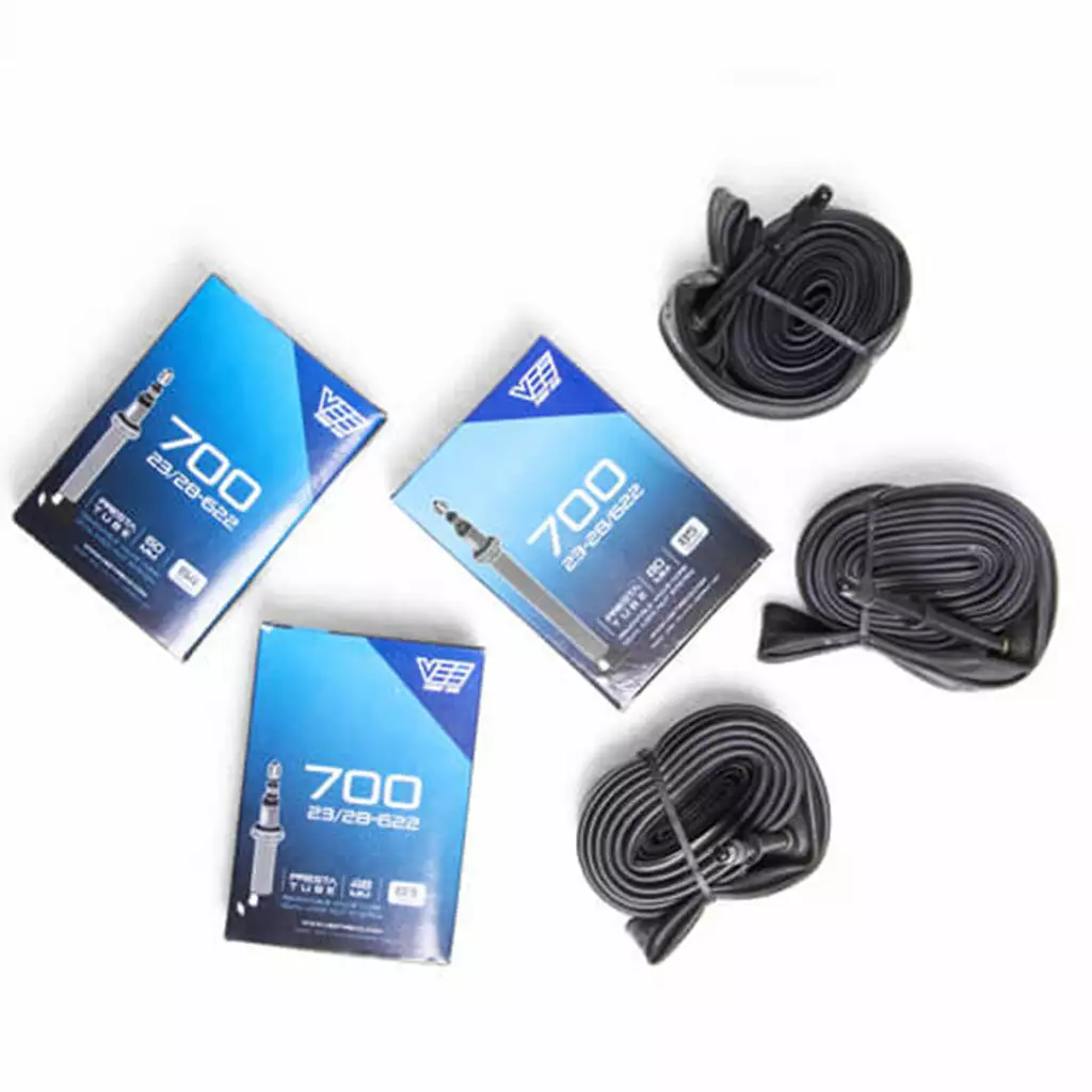 The Vee Tire Co. Presta Valve Tube at J&R Bicycles is a high-quality yet budget-friendly innertube replacement made with premium materials for max durability. Vike Bike Co. makes all their tubes by hand and every one is inflated and inspected before leaving the factory. The Presta tube features a removable valve core and dual-lock nut system.