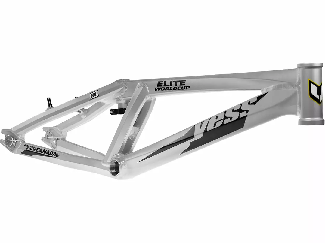 The Yess Elite World Cup BMX Race Frame-Silver is a structurally redesigned frame with similar geometry. The most notable changes will be the seat tube angle which will now be 72° and the seat-tube diameter which will accept a 22.2mm post. In addition the frame includes a seat clamp so a seperate one does not need to be purchased. The first shipment will be white or black only.