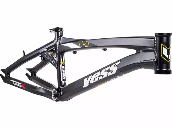 The YESS 2016 BMX race frame has got to be one of the stiffest aluminum frames we have seen to date. If you are looking for quality and performance the YESS frames are just that. The frames are handmade in Canada featuring CNC machined integrated headtube, machined bottom bracket, hydroformed tubing and increased welding surface for added stiffness. Includes the YESS quick release clamp and 15mm CNC machined dropouts with 3/8″ (10mm) adapters and tensioners.